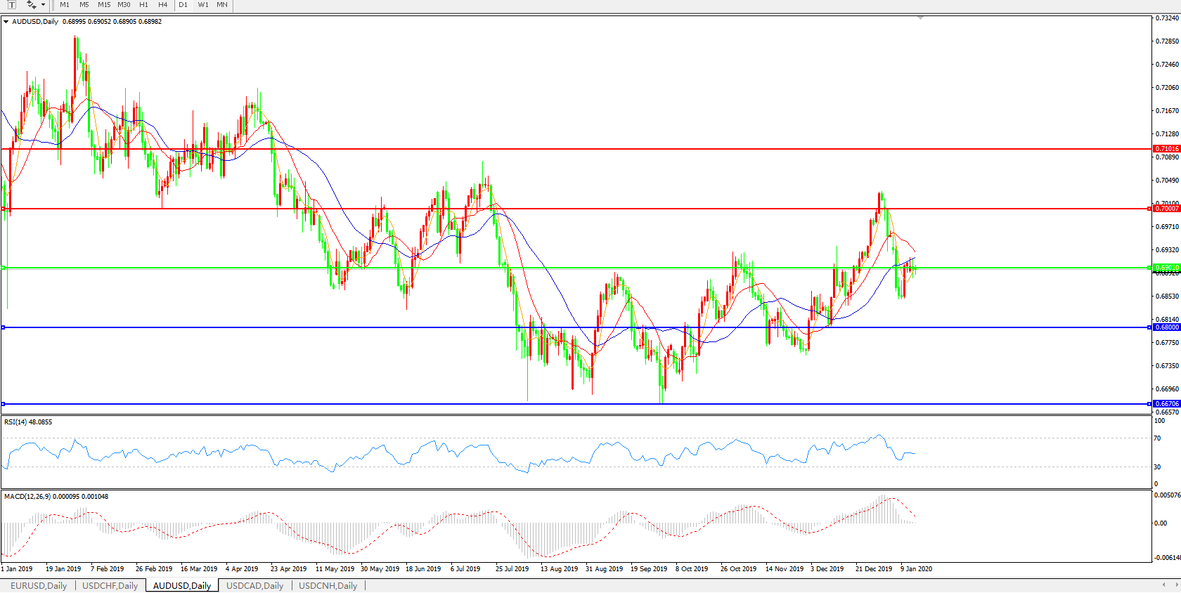 澳元兑美元在周二继续陷入盘整走势,基本无视了市场风险情绪进一步回暖所带来的提振。日内数据显示中国12月贸易进出口表现双双好于预期,而关键的中美一阶段贸易协定本周也将签署在即,这推动了日元与黄金等避险资产遭到抛售,但是澳元却并未如预期因此反弹;原因在于,澳大利亚国内的基本面负面消息压倒了来自外需领域的利好,市场更加担心该国持续失控的山林火灾对其经济基本面的冲击,以及对澳洲联储未来降息预期的提升,在澳洲联储2月降息概率已经过半的状况下,相关的负面情绪完全抵消了外部利多情绪提振; 这意味着澳元汇价仍无法彻底突破30日均线的阻力结束开年之际的单边跌势,而该国火情能否尽快得到控制则在很大程度上仍将左右澳元的后继走势,短线支撑在上周低位0.6850,失守后将打开更大范围的下行空间。