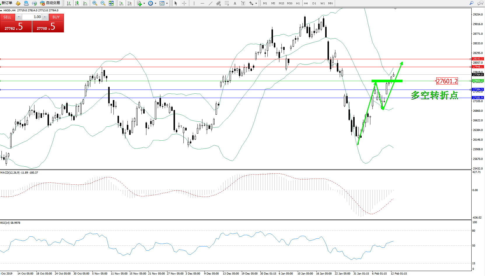 恒指HK50 ——4小时K线图显示: