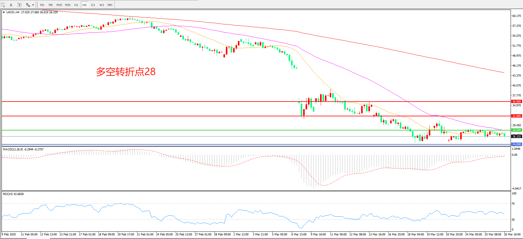 4小时图看,布油延续低位震荡,整体波幅不大,28美元成为短期多空分水岭,55周期均线逐渐下压,MACD绿柱减少,RSI指标走平,日内延续震荡概率较大。