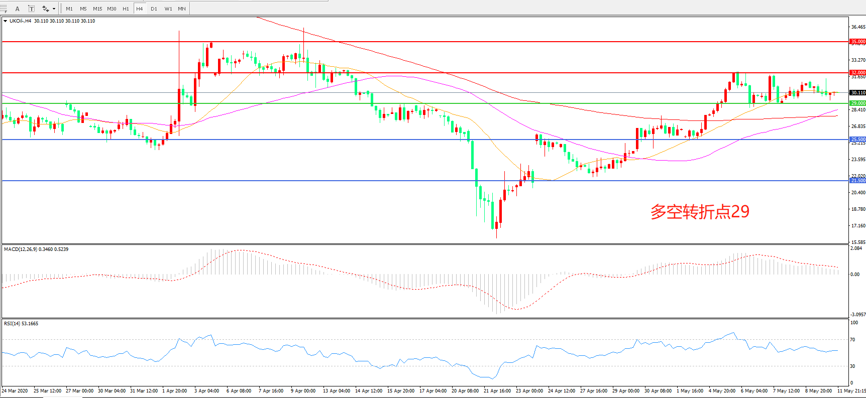 4小时图看,油价延续宽幅震荡,32美元称短期支撑,均线系统走平,MACD红柱减少,RSI指标走平,日内延续震荡概率较大。
