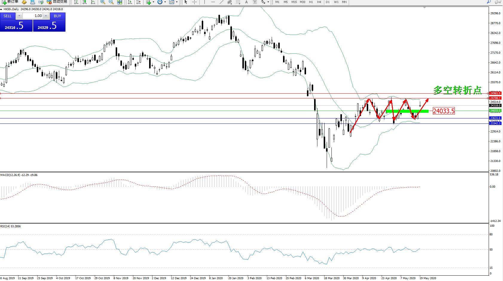 香港恒生指数5月19日(周二)收盘上涨453.36点,涨幅1.89%,报24388.13点;港股市场主要指数均大涨,三大指数全日维持高位震荡。航空股全线大涨,中芯国际升超7%,三大航空股均涨超4%;手机概念股、汽车股、石油股纷纷上涨,恒指国指成份股集体上涨,中国太平大涨超5%领衔走高;华彩控股午后获资金追捧,暴涨超100%。隔夜美国市场方面,冠状病毒疫苗研发取得进展和美联储主席讲话提振了市场乐观情绪。特朗普再次敦促美国重启经济。美国更多地区重新开放。欧洲多个国家宣布将解除申根地区旅行限制,加强了市场对发达经济体解封的期待。