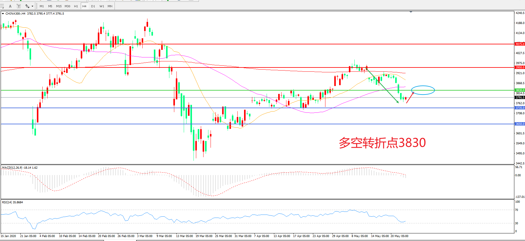 4小时图看,沪深300连续长阴下破,前期涨势基本被吞没,短期走势偏空, 均线系统成为上方阻力, MACD红柱减少,RSI指标向下,日内延续下行概率较大。