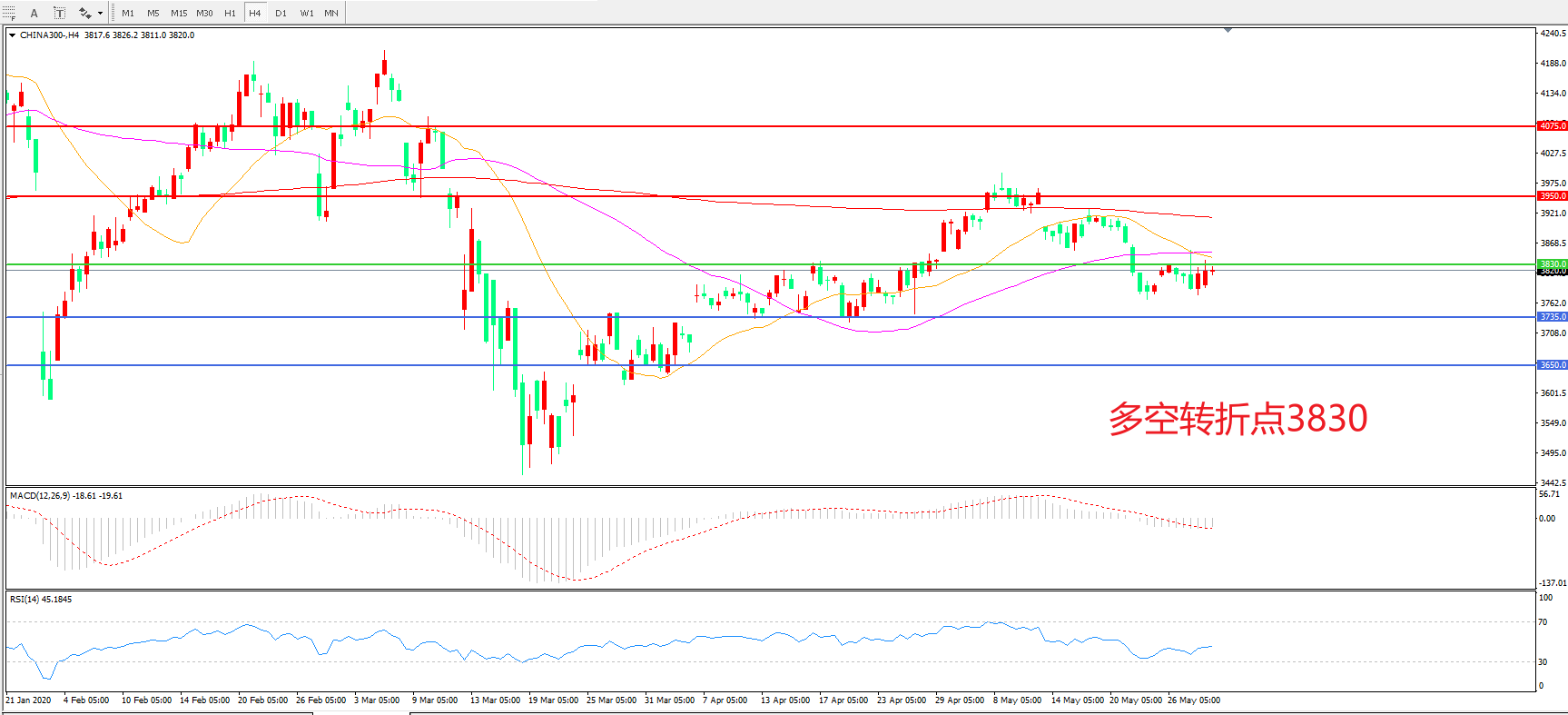 4小时图看,沪深300延续震荡走势,多空博弈胶着,3830成为短期多空分水岭,均线系统走平, 形成阻力区间,MACD绿柱增加,RSI指标走平,日内延续震荡概率较大。