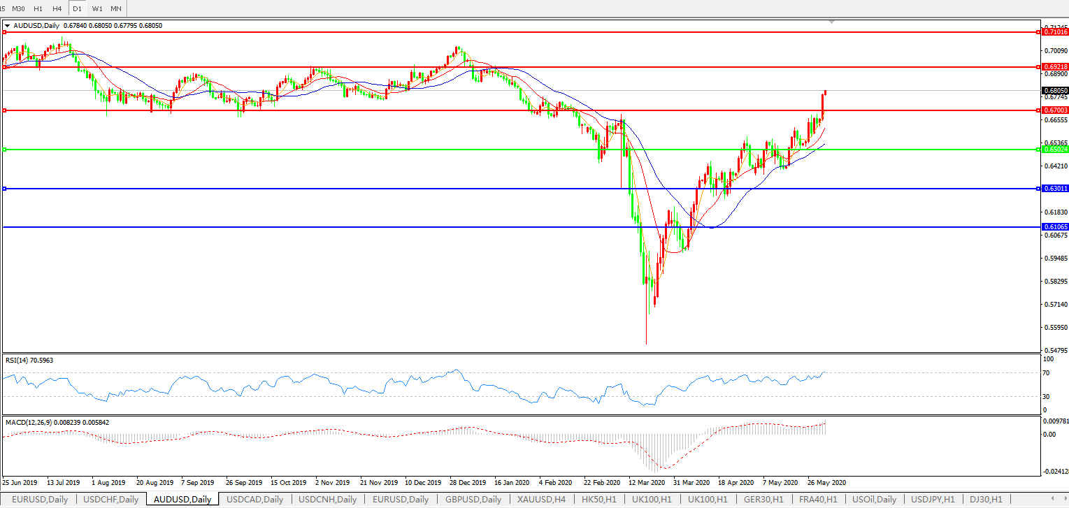 技术面简析:日图均线呈有序多头排列,汇价持续走高冲击0.68关口,MACD运行于0轴上方且量能快速放量,RSI震荡后再度走升,预计汇价大概率将进一步上行。