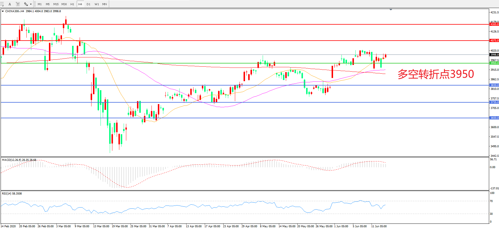 4小时图看,沪深300延续高位震荡走势,3950成为短期多空分水岭,55周期均线成为支撑,均线系统走平,MACD红柱缩短,RSI指标向下,日内延续震荡概率较大。