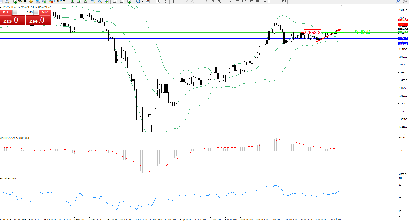 日经225指数715日(周三)收盘上涨342.99点,涨幅1.52%,报22930.00点。日本央行决定维持主要货币政策工具不变,符合市场预期,但日本存经济风险,通胀前景偏向下跌,由于疫情导致销售下滑,企业资金面临压力。此外日本东京将疫情警戒提升至最高级别,但日本央行表示经济正处于极其严峻的形势,且下调了今年及后年的经济增速预期,据日本共同社报道,东京都政府15日决定,将有关新冠肺炎疫情的4个阶段指标上调至最高级别。近期东京疫情出现反弹,从本月9日到14日,东京单日新增新冠肺炎确诊病例已经连续6天超过100人。