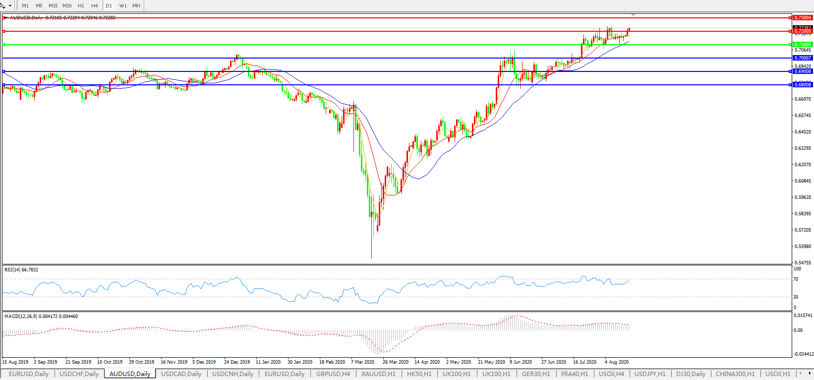 巴克莱和盛宝银行表示,美元可能会暂时获得一些支撑,因为美国刺激方案谈判陷入僵局,使投资者更加厌恶风险。不过,目前尚不清楚美元反弹是否会持久,特别是在美国总统大选临近,且美联储料至少直到明年年底都将维持政策利率在当前水平的情况下;对冲基金AVM Global Opportunity Fund的创始人Ashvin Murthy谈到美元时说,长期下降趋势很明显,尤其是与那些正在实施量化宽松并正在经历更好复苏的国家相比,趋势可能出现调整,但这将是逢高卖出美元的机会澳元上涨0.60%至0.7214,为8月7日以来最高水平;澳元兑纽元的买盘帮助提振了澳元兑美元;澳元兑纽元突破1.1000,稍早一度创下7月21日以来最大涨幅;获利回吐压力使该货币对涨势在1.1028受限。