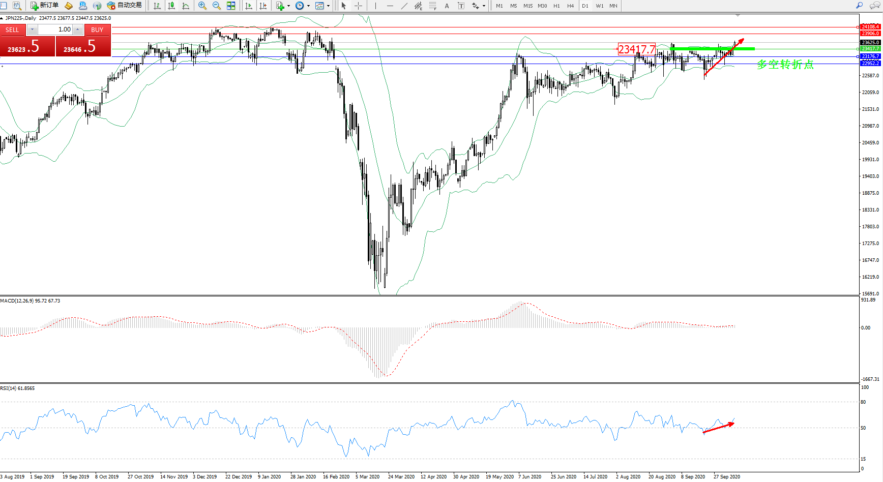 日经225指数10月8日(周四)收盘上涨215.68点,涨幅0.92%,报23638.50点。因特朗普发布了一系列推文呼吁分批次实施刺激计划,投资者对于刺激协议仍报希望,特朗普支持单项援助方法提振了依旧,美国股市上涨提振了市场的风险偏好。美元指数跌0.19%至93.64;因有望至少在11月3日美国总统大选之前达成部分财政刺激计划令风险意愿改善,且投资者消化下个月民主党在大选中获胜的前景;日经对美联储公布的9月会议记录无甚反应。据知情人士透露,美国总统唐纳德· 特朗普希望最早下周一在宾夕法尼亚州举行的一项活动中重返竞选活动,并在该周晚些时候前往密歇根州和佛罗里达州。特朗普说,这是特朗普自10月1日被诊断出感染新冠病毒以来的首次出行。上述活动目前只是暂订,计划可能会发生变化。根据目前的计划,特朗普周一将前往宾夕法尼亚州,週二前往密歇根州。