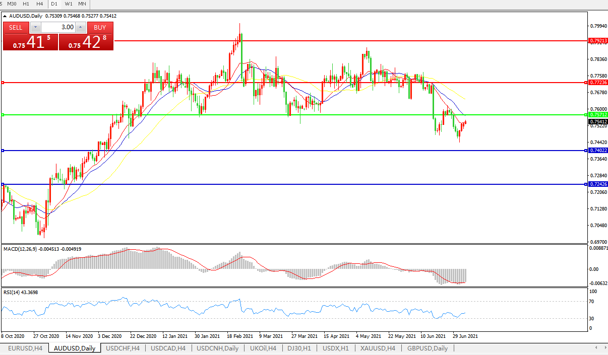 交易策略:0.7570下方看跌,目标0.7400、0.7240