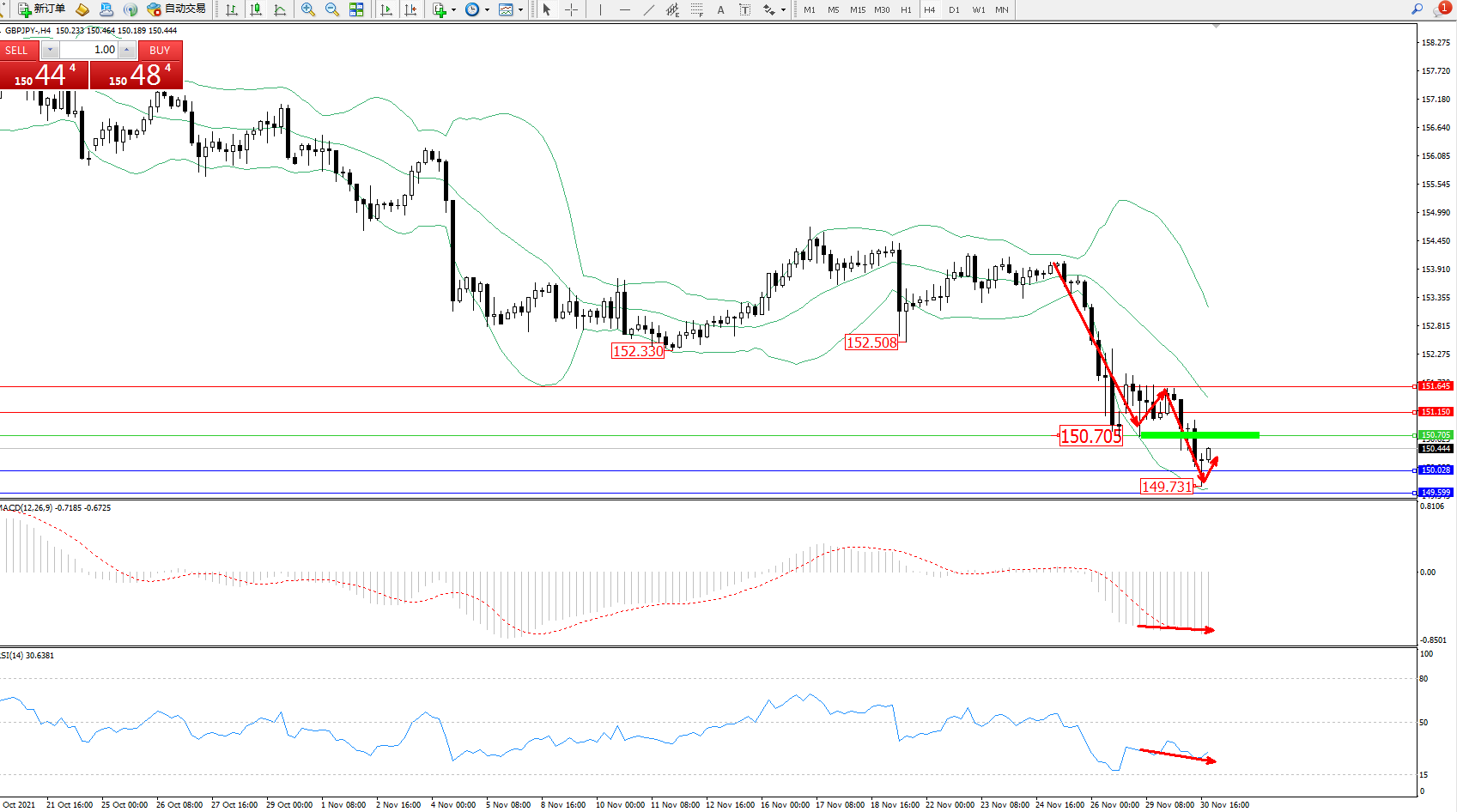 技术点评:空头动力延续布林带指标通道中下轨区间持续震荡下行,低位抵达149.731位置后得到短暂支撑反转上移,但整体市场下行态势良好,跌势依旧,布林带指标呈张口走势后开始收口下行,MACD指标处于空头区域维持整理平移,RSI指标处于空头区域持续徘徊中;