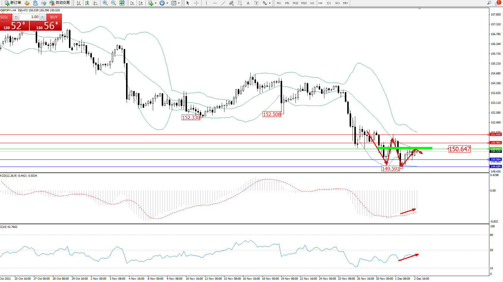 技术点评:空头动力延续布林带指标通道中下轨区间持续震荡向下移动,低位抵达149.591位置后得到短暂支撑开始缓慢上移,期间多次触及中下轨区间节点,布林带指标呈收口走势持续向下移动,MACD指标低位多头动力开始缓慢上移,RSI指标处于空头区域维持震荡向上拉升中;