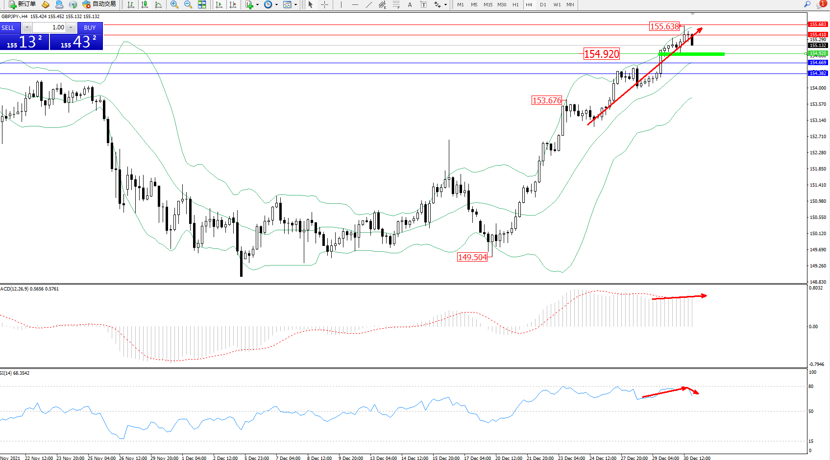 技术点评:多头动力延续布林带指标通道中上轨区间持续震荡上扬,高位抵达155.638位置的压制开始震荡,短期或维持高位整理,布林带指标呈上行趋势态势良好,MACD指标处于多头区域维持整理平移,RSI指标处于多头区域多次触及超买区80均衡线附近节点后回撤;