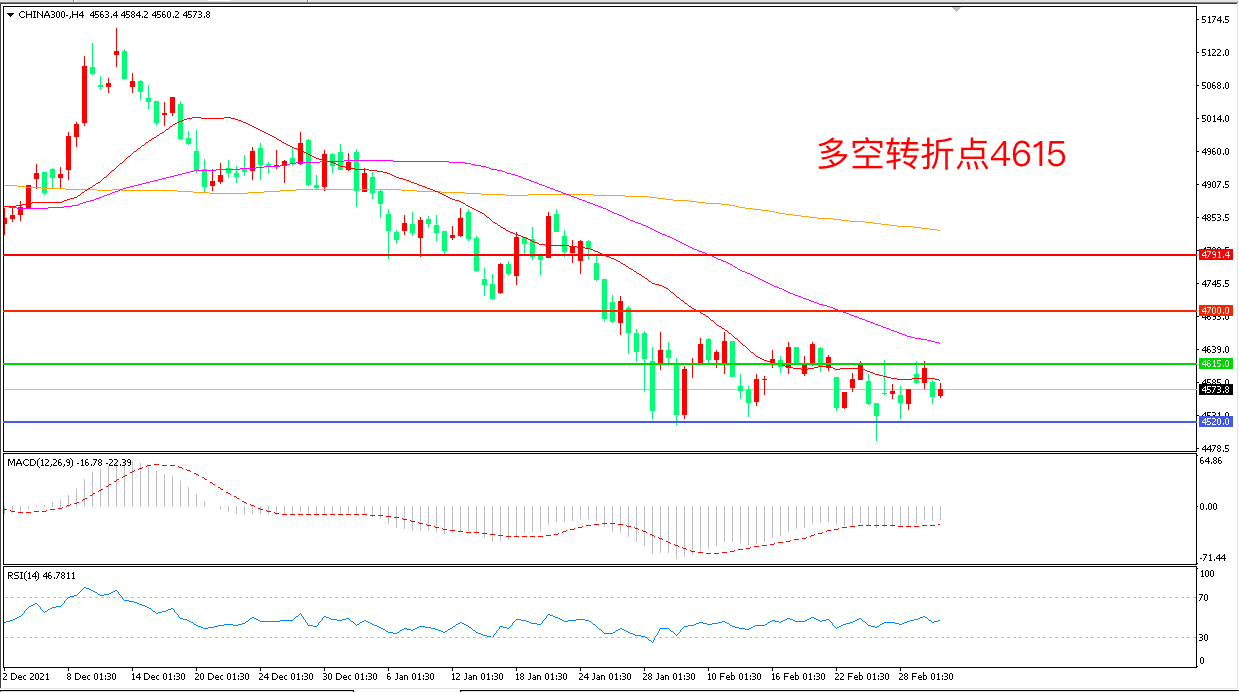4小时图看,沪深300 区间震荡迹象明显,4615成为上方阻力,4520成为下方支撑, MACD绿柱增加,RSI指标走平,日内延续震荡概率较大。