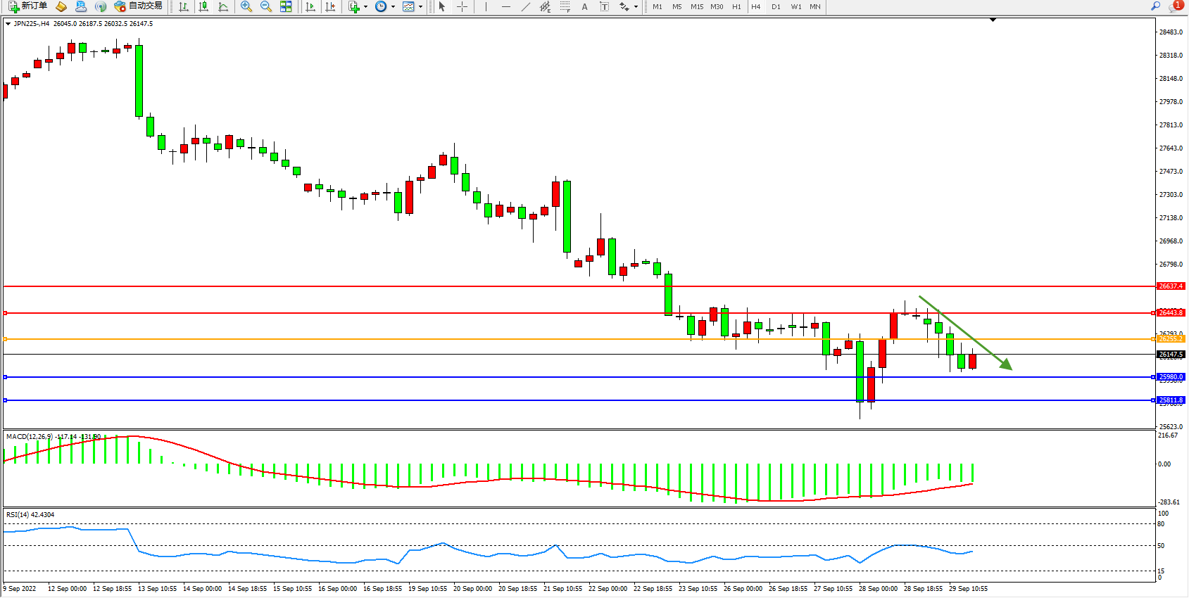 日经225指数9月29日(周四)收盘上涨266.52点,涨幅1.02%,报26440.50点。根据金融机构在日本央行往来账户余额的变动预测,加上货币市场相关讯息,估计日本央行于上次干预汇市上动用约3.6万亿日元(约250亿美元),预期日本最多可进行10次干预汇市行动。