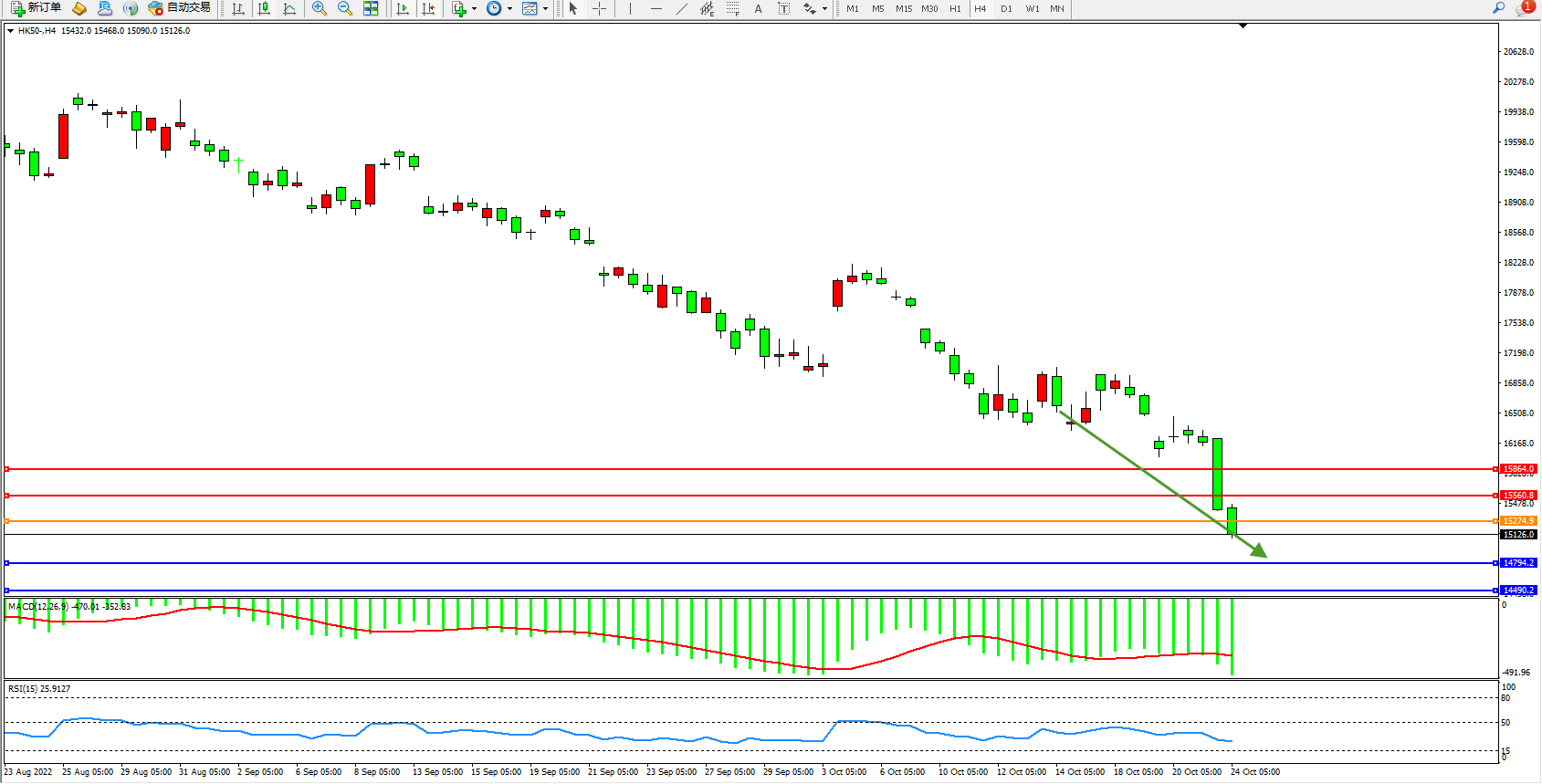 香港恒生指数10月24日(周一)收盘下跌1030.43点,跌幅6.36%,报15180.69点;港股今日低开低走,三大指数全天呈单边下跌行情,市场情绪降至冰点。恒指跌6.36%重挫超千点,国指跌7.3%连续失守整关口,恒生科技指数更是大跌9.65%险守2800点,三者再度刷新调整低位。大型科技股领衔大市走低。