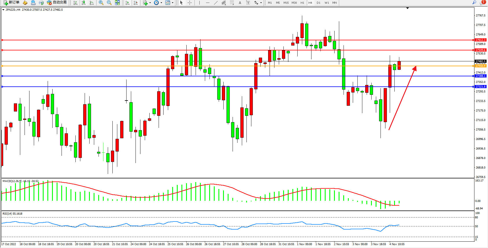 日经225指数11月4日(周五)收盘下跌488.89点,跌幅1.77%,报27174.50点。日本10月服务业活动以四个月来最快的速度增长,因为对外国旅客入境限制放宽和国内旅游形势好转,提振了人们的信心。