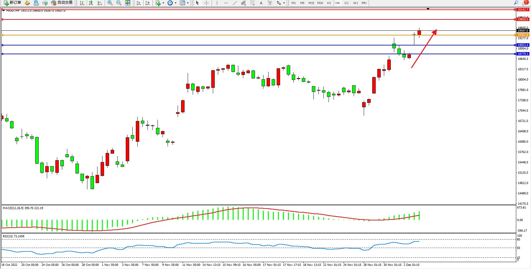 香港恒生指数12月5日(周一)收盘上涨842.94点,涨幅4.51%,报19518.29点;北上广深杭等多地积极优化防控措施,市场情绪爆棚,港股三大指数全天呈单边上涨行情,恒生科技指数尾盘逼近“涨停”,最终收涨9.27%重回4200点上方,恒指、国指分别大涨4.51%和5.3%,恒指上扬842点,三者均刷新反弹新高。大型科技股涨势惊人,小米、京东、百度均涨超11%,阿里巴巴涨超9%,摩根士丹利将MSCI中国指数2023年底目标点位从59点提高到70点,将恒指的目标点位从18200点提高到21200点。