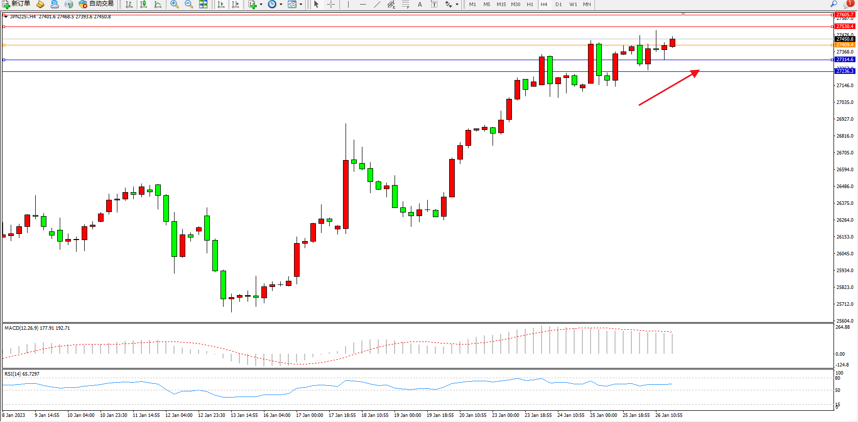 日经225指数1月26日(周四)收盘下跌59.51点,跌幅0.22%,报27335.50点。日本政府打算在3月底将修改的《观光立国推进基本计划》(2023至2025年度)中,写入国内旅行年消费额20万亿日元(约合人民币1万亿元)的目标。这是与新冠疫情爆发前相同的水平。政府将力争在对象时期内早日达成目标。