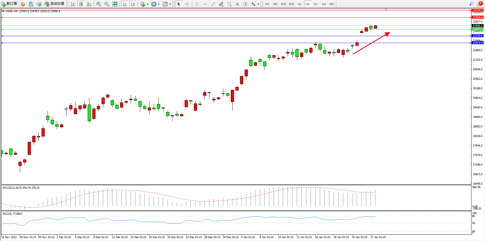香港恒生指数1月27日(周五)收盘上涨122.12点,涨幅0.54%,报22688.9点;港股延续近期上涨惯性,恒指全天收涨0.54%报22688点,续刷阶段新高,成交额972.5亿港元,国指、恒生科技指数分别涨0.87%、1%。板块走势分化,软件开发板块受商汤大涨约20%带动,全天处于领涨状态。