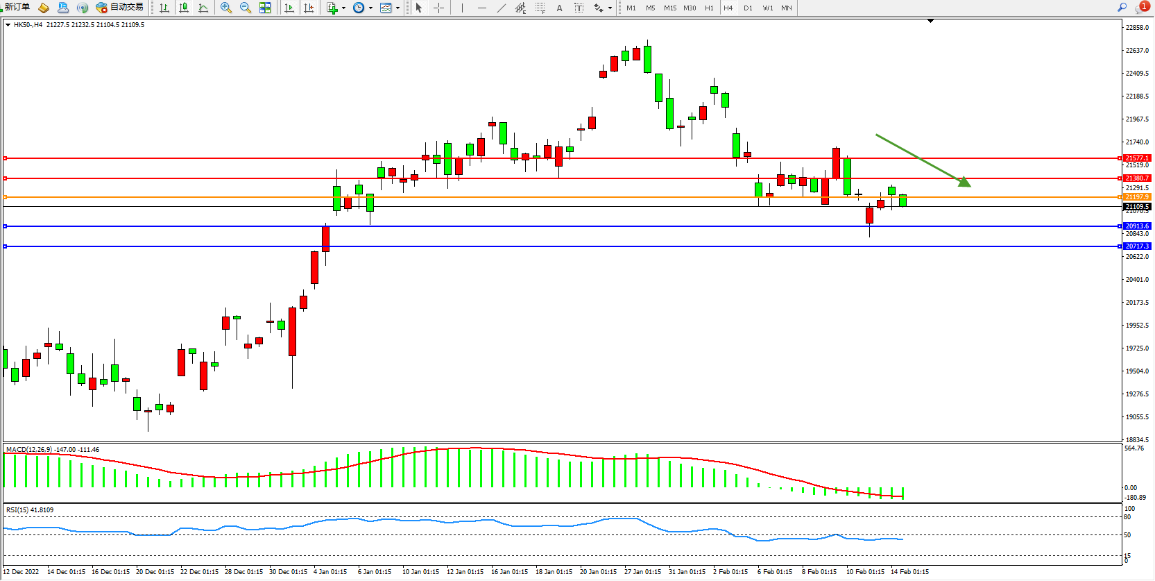 香港恒生指数2月14日(周二)收盘下跌50.66点,跌幅0.24%,报21113.76点;港股午后再度走低,恒生科技指数最终下跌1.01%,恒指、国指分别跌0.24%和0.48%。盘面上,大型科技股普遍走弱令大市承压,腾讯跌2%,香港金管局在纽约时段承接港元沽盘,买入42.23亿港元,是今年首次,星期三银行体系结余减至918.64亿港元。而近期疲弱的港元拆息亦普遍下跌。