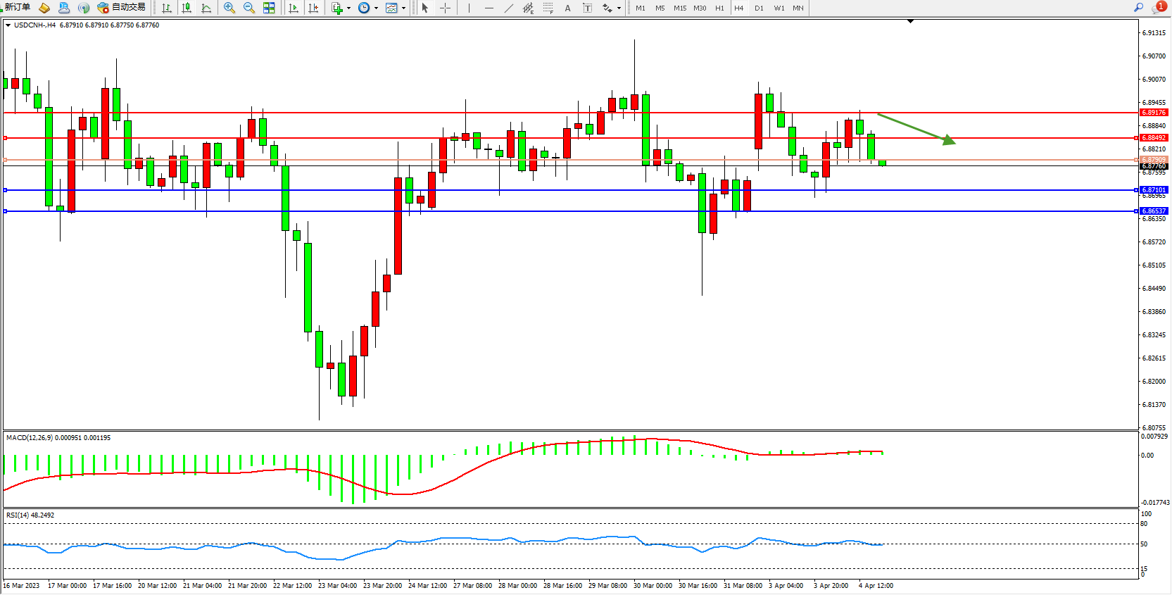 美元人民币USDCNH——4小时K线图显示: