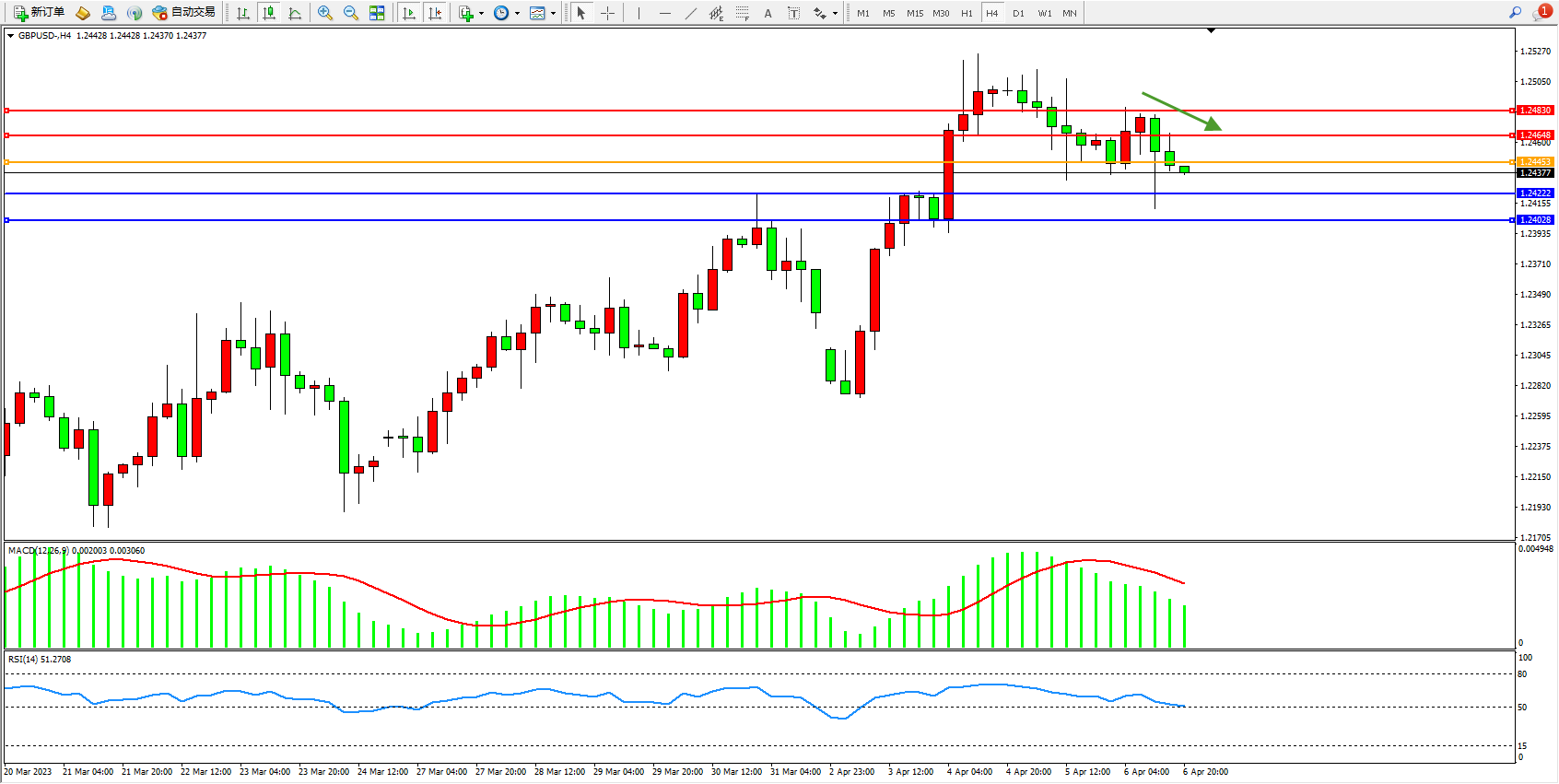 交易策略:1.24452下方看跌,目标1.24222  1.24028
