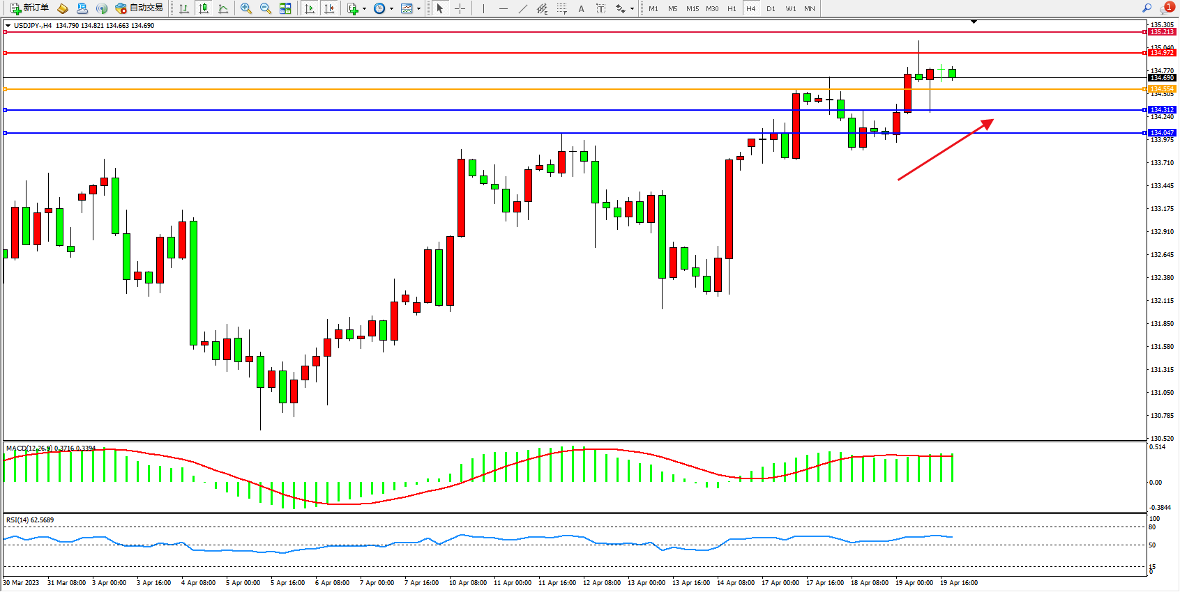 4小时图看:多头动力高位震荡上行中,短期看涨情绪依旧,市场多头动力不断攀升,MACD指标处于多头区域整理,RSI指标处于多头区域弱势徘徊;