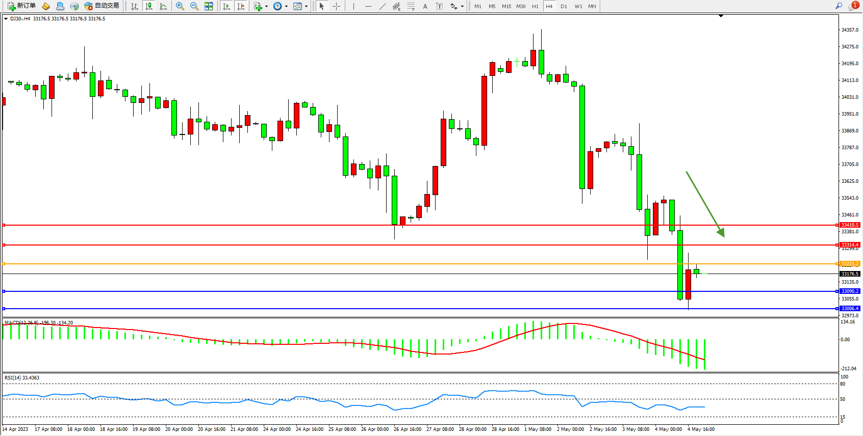 道琼斯指数5月4日(周四)收盘下跌286.30点,跌幅0.86%,报33127.94点;就业数据对美联储肯定已经结束加息周期的观点有点不友好。初请失业救济人数接近预期,而续请失业救济人数实际下降至180.5万人,与经济学家小幅上升至186.5万人的预期相反。