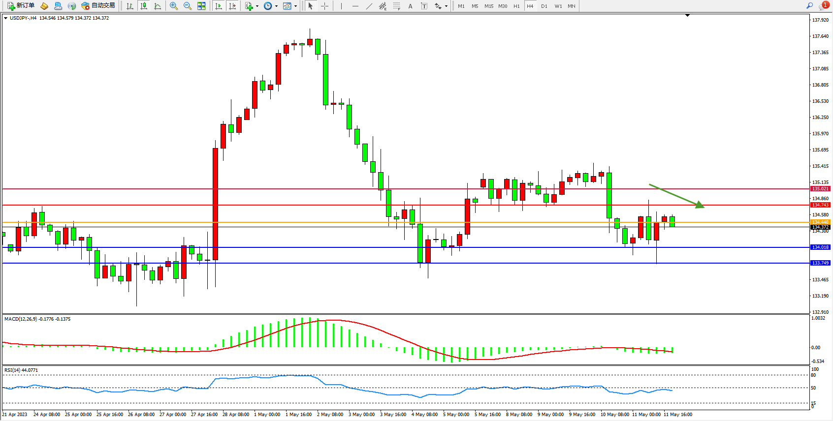交易策略:134.372下方看跌,目标134.018  133.749