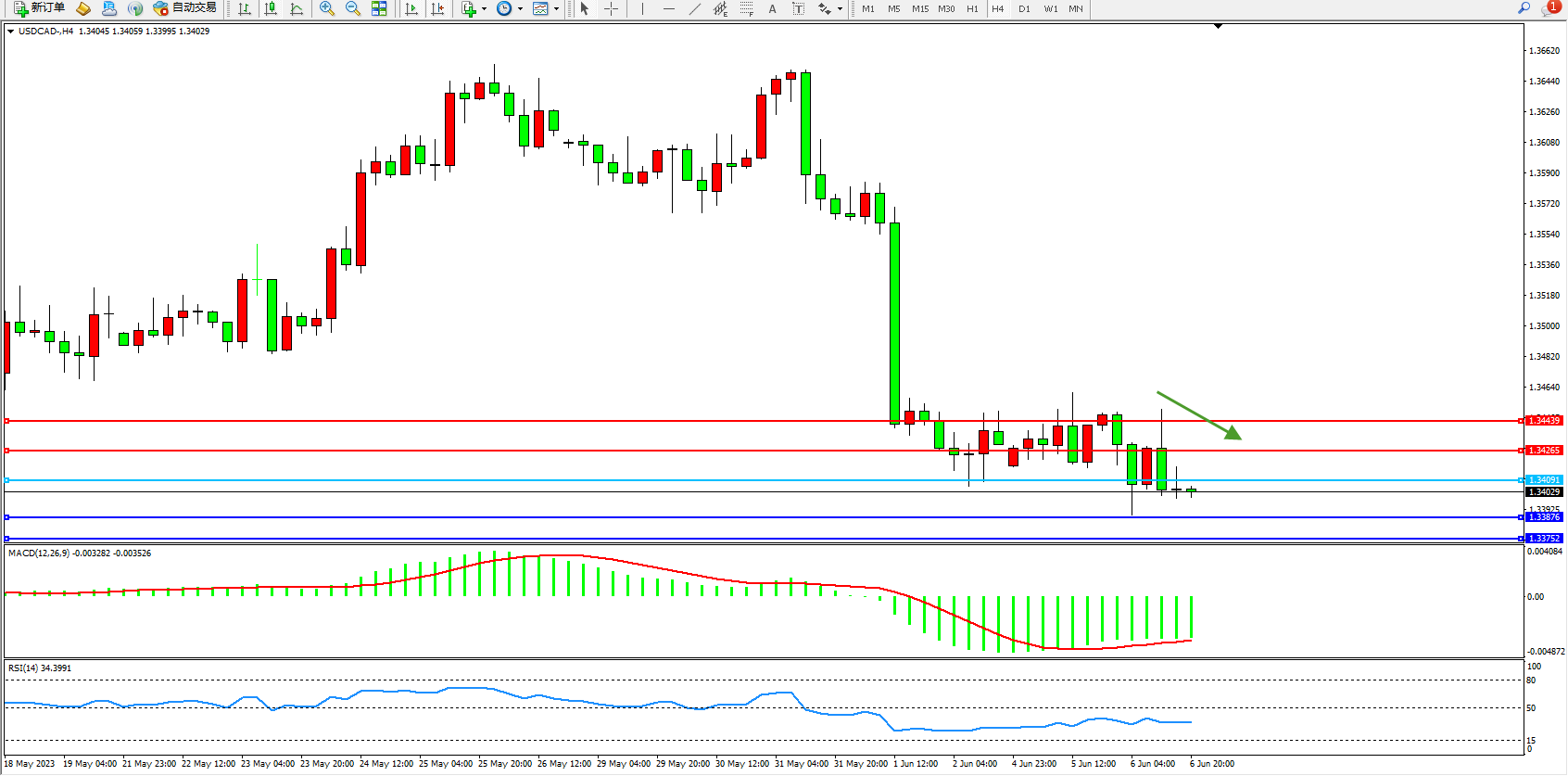 美元加元USDCAD——4小时K线图显示: