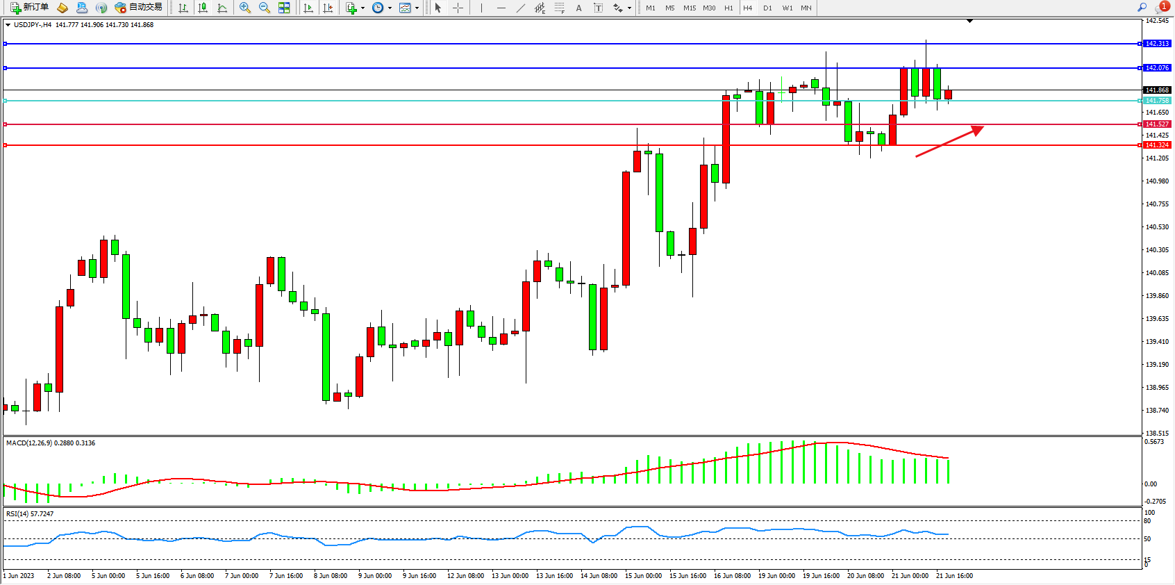 交易策略:141.758上方看涨,目标142.076 142.313