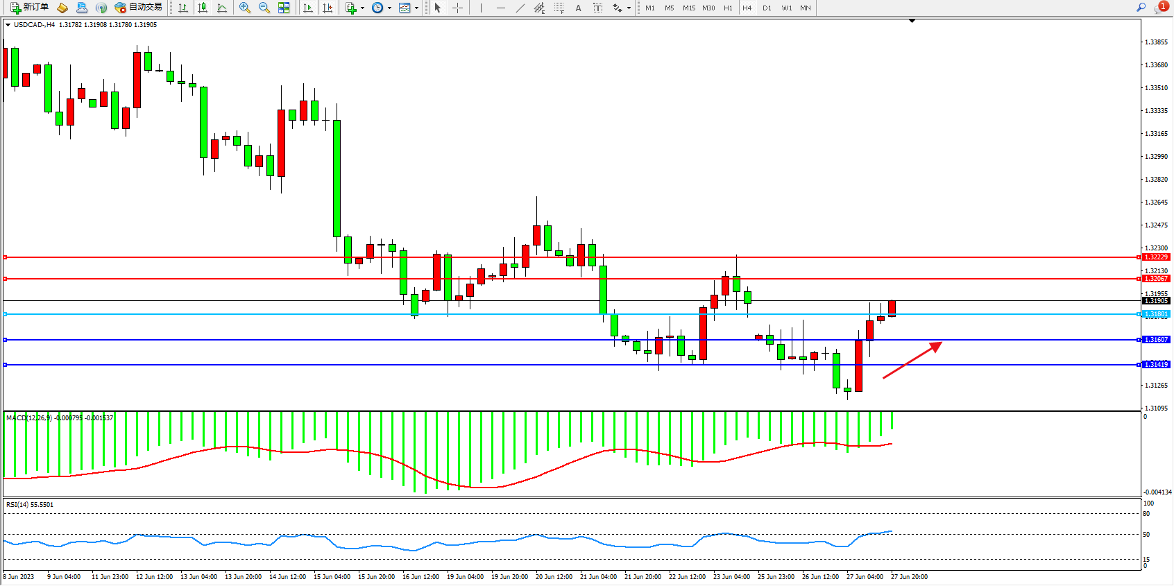 4小时图看:低位多头动力强势震荡拉升,市场看涨情绪涌现,短期有继续向上移动态势,MACD指标处于空头区域震荡向上移动,RSI指标处于50均衡线上側弱势徘徊;