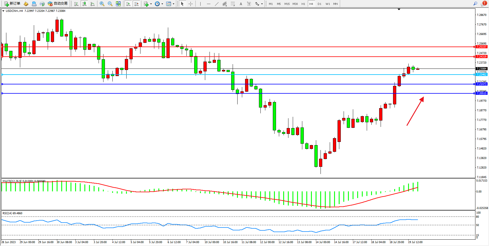 交易策略:7.22462上方看涨,目标7.24319 7.25337