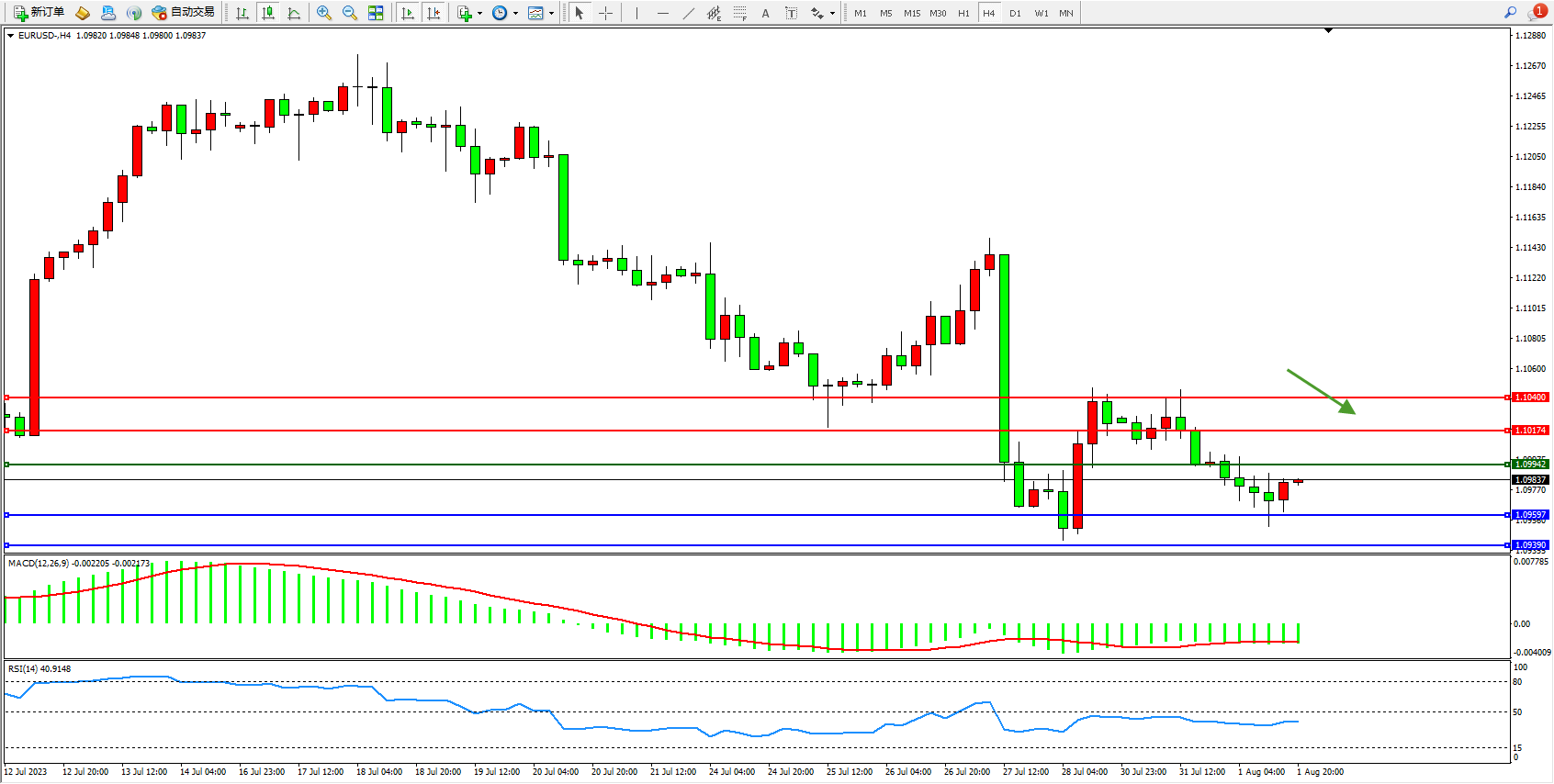 欧元美元EURUSD—4小时K线图显示: