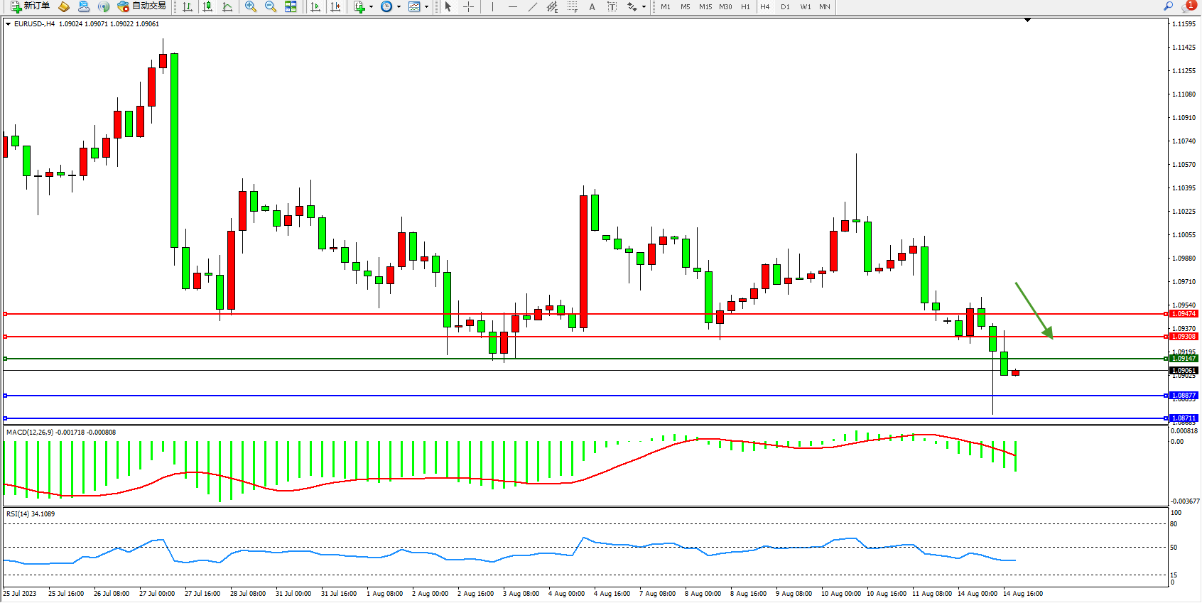 欧元美元EURUSD—4小时K线图显示: