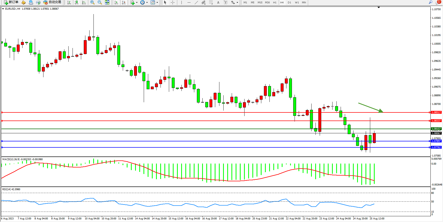 欧元美元EURUSD—4小时K线图显示: