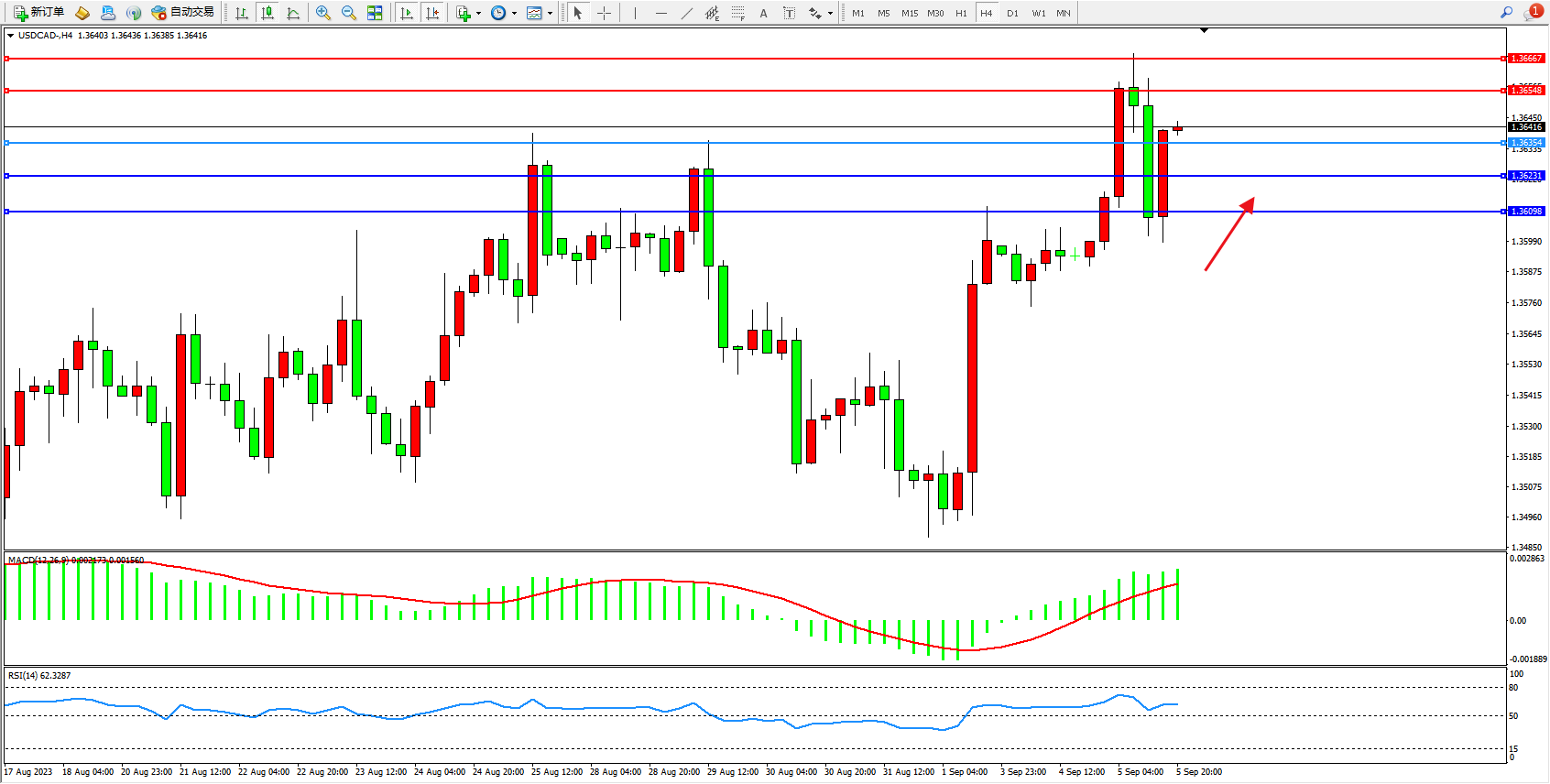 美元加元USDCAD——4小时K线图显示: