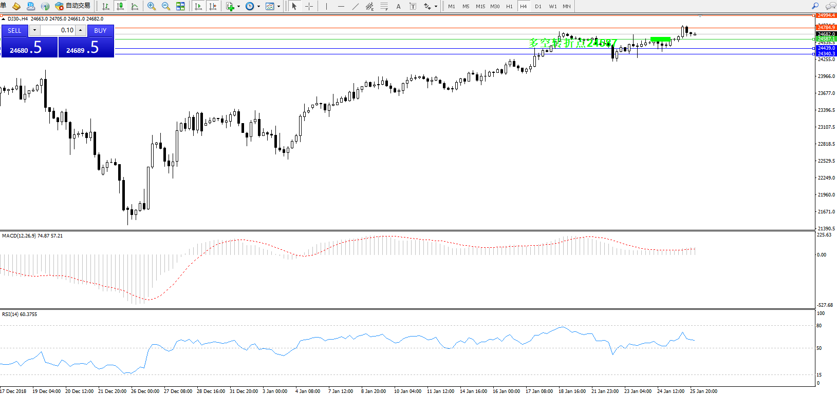 道琼斯指数DJ30—— 4小时K线图显示:
