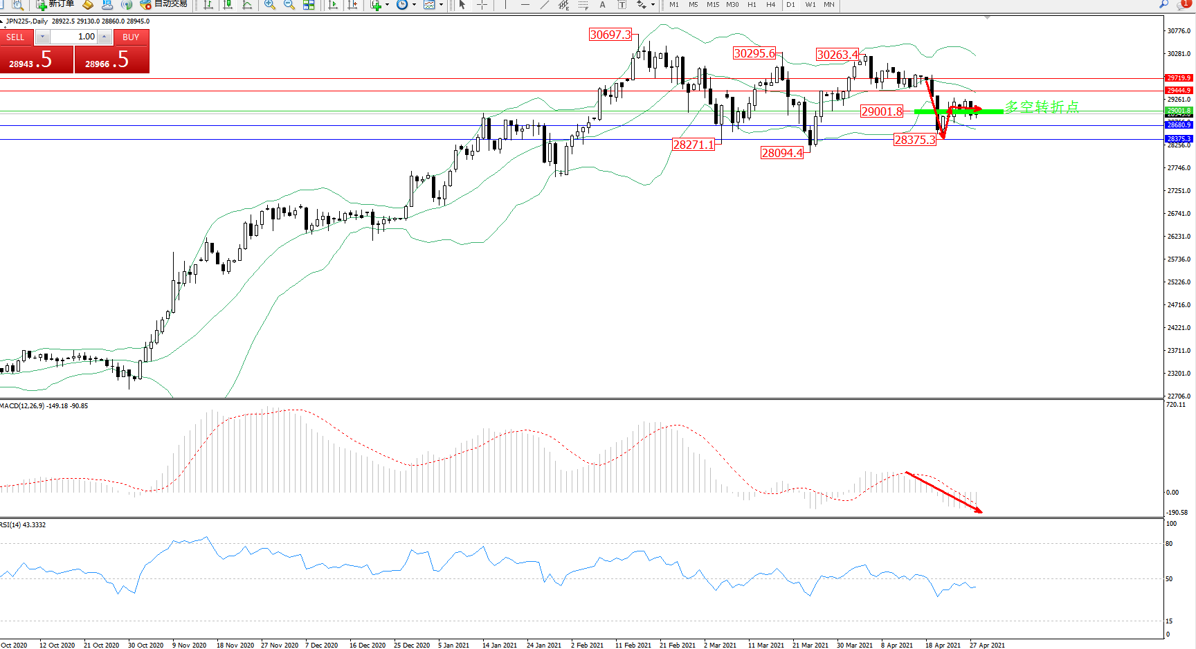 日经225指数4月28日(周三)收盘上涨71.11点,涨幅0.25%,报29063.00点。因印度新冠疫情呈暴发式扩散趋势,日本政府拟将印度指定为“变异病毒流行国家”,以强化入境管制。最早或于5月1日开始实施针对印度的入境对策。日本政府规定,外国人士入境日本后需要隔离14天。而一旦被指定为“变异病毒流行国家”,从该国入境日本后3天内,入境人员需要在指定住宿设施隔离。日本政府目前已指定了英国、南非等29个国家和地区为“变异病毒流行国家”。