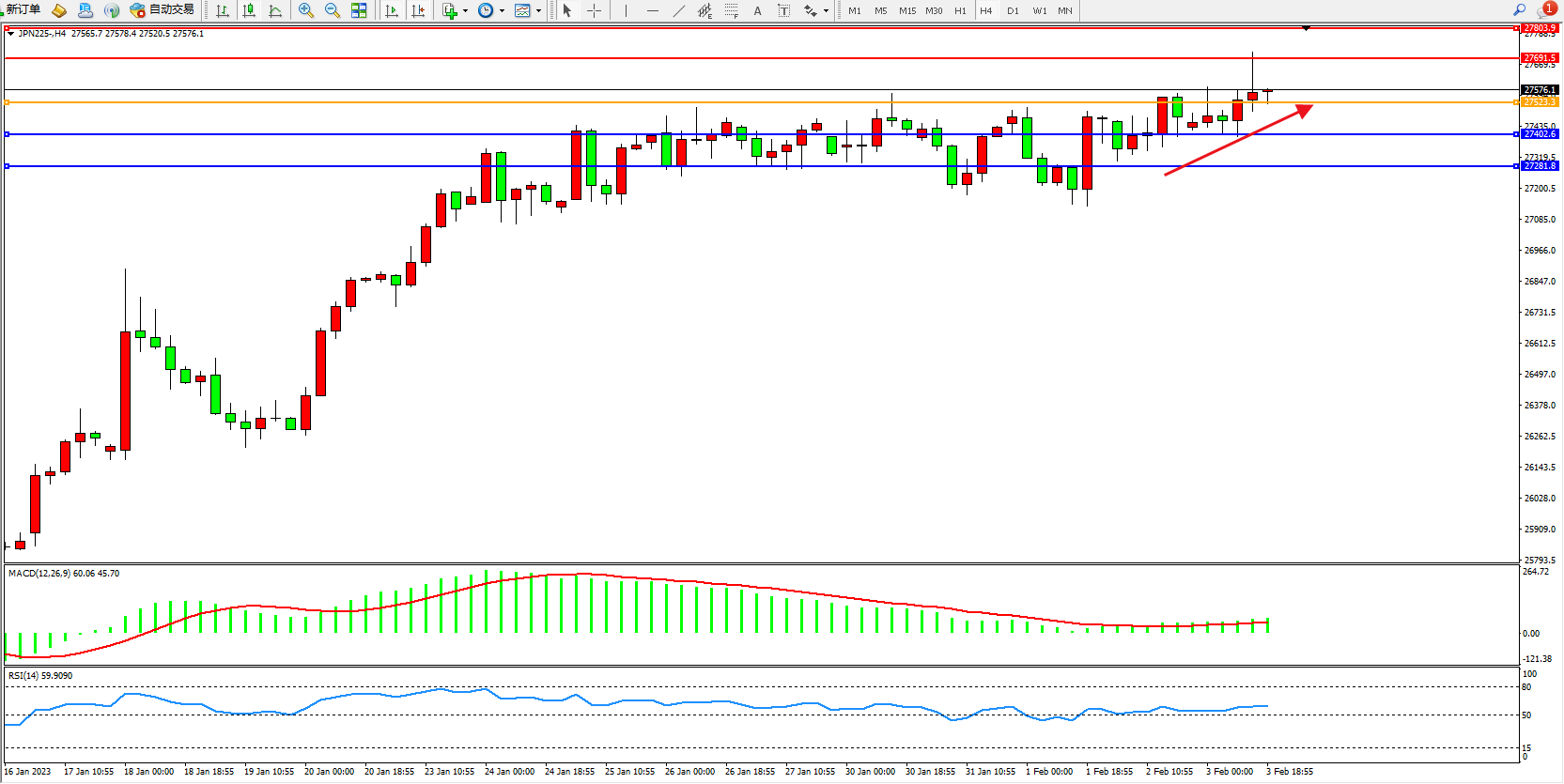 日经225指数2月3日(周五)收盘上涨106.45点,涨幅0.39%,报27508.50点。日本财务大臣铃木俊一:将继续以2025财年实现基本平衡为目标,不能说目前的低收益率将会永远持续下去。